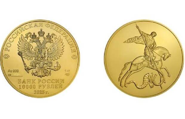 Банк России 28 октября 2025 года выпускает в обращение новую инвестиционную золотую монету «Георгий Победоносец» номиналом 10 000 рублей. Монета весом 1 000 граммов из золота 999 пробы выполнена в форме круга диаметром 100 мм. По краям обеих сторон расположен выступающий кант.