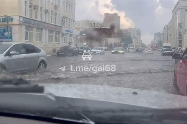 Сильный дождь, начавшийся утром 15 июля, привел к подтоплению центральной улицы Карла Маркса в Тамбове. Ливень не прекращается до сих пор, и дорога превратилась в полноводный поток.