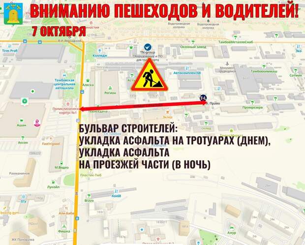 В Тамбове продолжаются масштабные дорожные работы. Они проходят в разных частях города. Так, сегодня на бульваре Строителей запланирована укладка асфальта: днем - на тротуарах, ночью - на проезжей части.