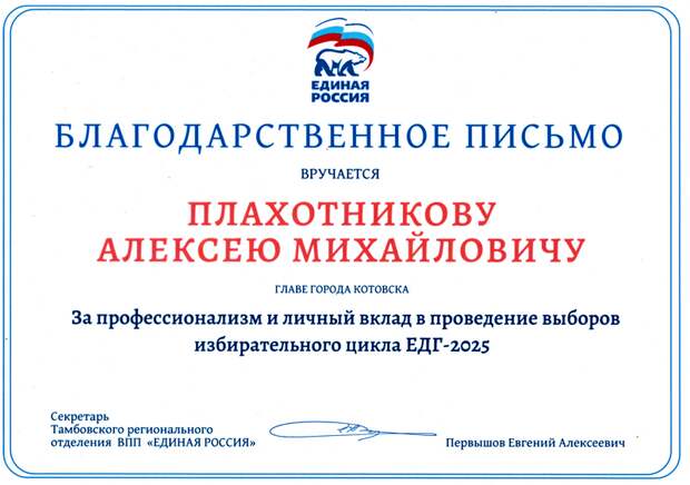 «Благодарю Евгения Первышова и региональное руководство партии за высокую оценку нашей работы. Это не просто формальность — это признание труда всей команды Котовска: от сотрудников администрации и избирательных комиссий до волонтёров и активных жителей. Мы делали всё для того, чтобы выборы прошли честно, прозрачно и с максимальным вовлечением граждан. Уверен: наша совместная работа в 2025 году — это фундамент для ещё более масштабных достижений в 2026-м. Мы не остановимся — впереди новые проекты, новые решения и ещё большая ответственность перед людьми», - сказал Алексей Плахотников.