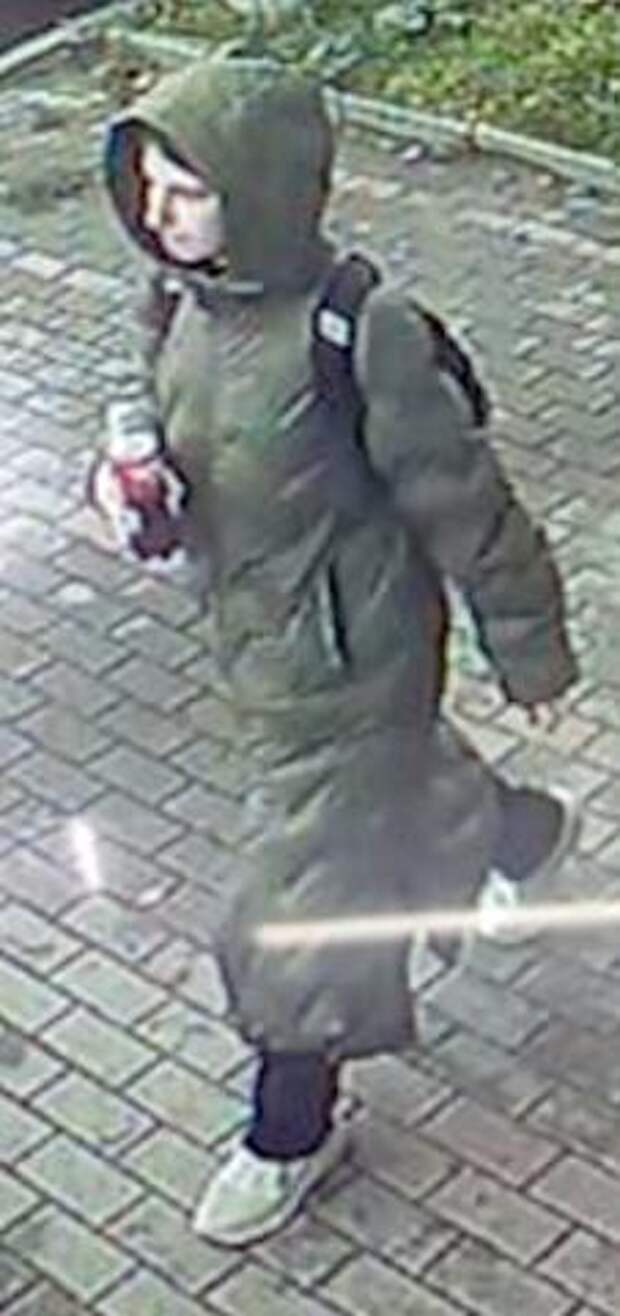Была одета в удлинённую зелёную куртку, чёрные брюки и белые кроссовки.
